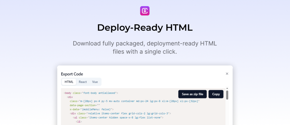- Deploy-Ready HTML: Download fully packaged, deployment-ready HTML files with a single click.