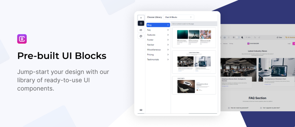 - Pre-built UI Blocks: Jump-start your design with our library of ready-to-use UI components.