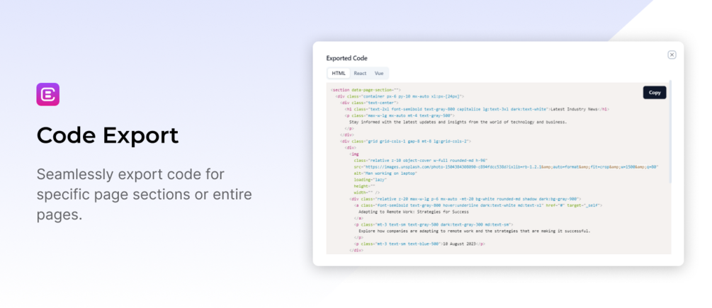 - Code Export: Seamlessly export code for specific page sections or entire pages.